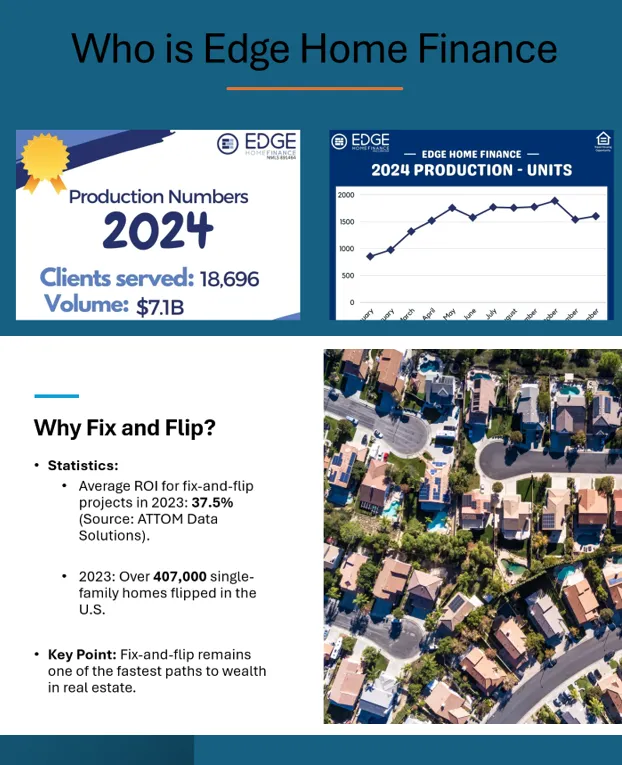 At Edge, we specialize in helping real estate investors turn distressed properties into profitable opportunities. Whether you're flipping your first home or your fifteenth, our fix & flip loan solutions are designed to move at the speed of your project.